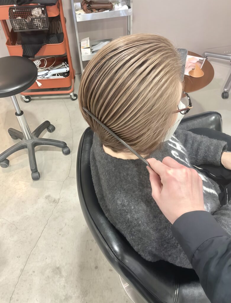小平でショート×白髪ぼかしハイライトをしている中江です。